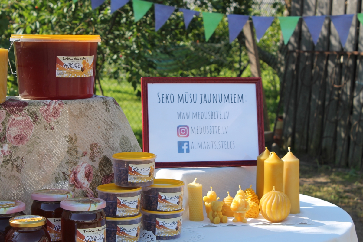 Mūsu produkcijas klāstā ietilpst dažādu ziedu un viršu medus, bišu maize, propolisa izstrādājumi un bišu vaska sveces.