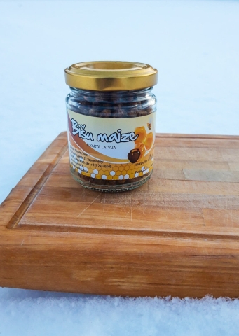 100 grami bišu maizes fasēta stikla burciņā ar metāla vāku. Bišu maize ir vērtīgs uztura bagātinātājs, ko radījušas pašas bites, pāstrādājot ziedputekšņus.