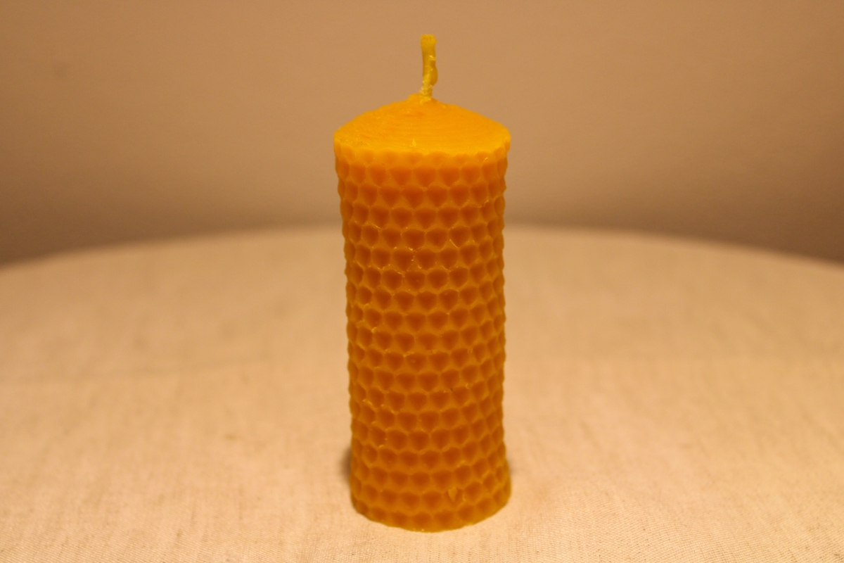 Cilindra formas bišu vaska svece ar dekoratīvu šūnu imitāciju.
